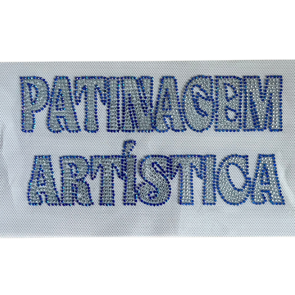 Transfer em strass com a frase Patinagem Artística, disponível em várias cores e ideal para personalizar roupa e acessórios. Dimensões: 20×10 cm.