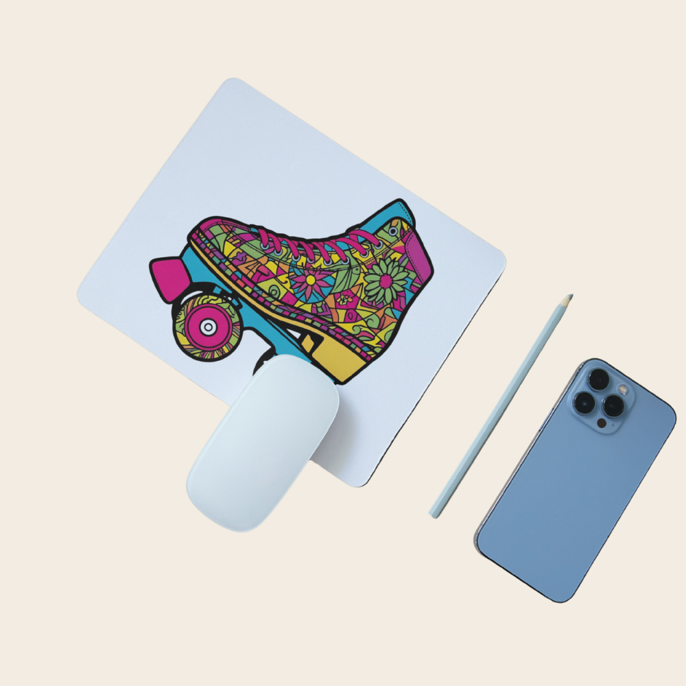Traga um toque de cor e criatividade à sua secretária com este tapete de rato de design único! O nosso Tapete de Rato “Patim Colorido” apresenta um patim clássico com um padrão floral e abstrato vibrante, perfeito para quem procura um toque de originalidade e alegria no seu espaço de trabalho.